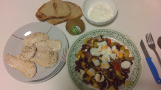 13:00 h. Pues reconozco que hacía bastante que no tomaba legumbres... Y hoy por fin, ya encontré, y a partir de ahora, se incluyen en mi "dieta" de urgencia. Hoy, ensalada de verano con alubias, un huevo cocido, patata, cebolla, tomate y berenjena. De segundo, pechuga de pollo cocinada con orégano a la plancha, unas tostadas de hogaza, yogurt natural 0% grasa con genial índice proteico y un kiwi.